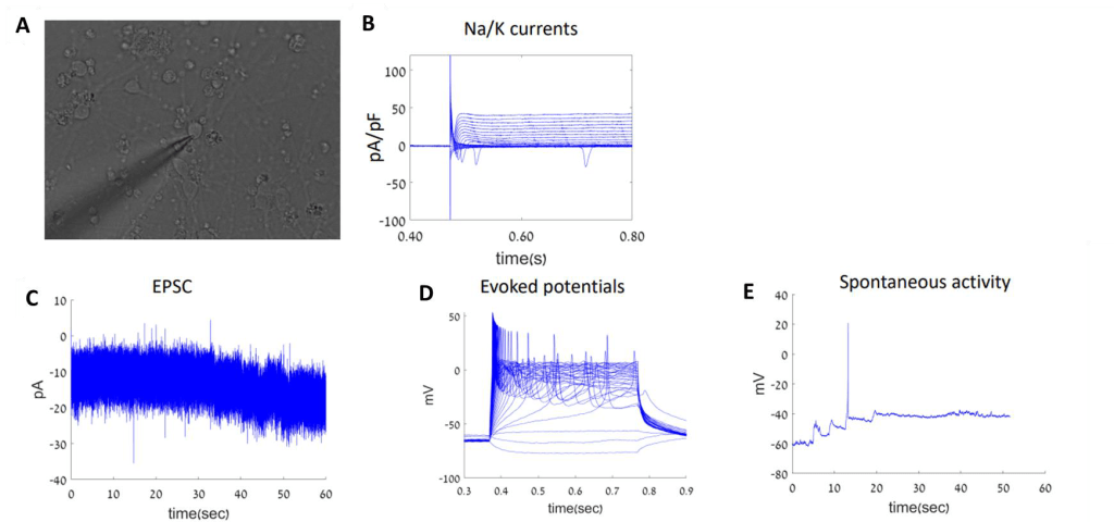 Figure 2. (A) An image of the cells during the experiment. The patch pipette is visible on the left. (B) The Sodium/potassium currents were recorded in voltage clamp mode with test potentials of -100 mV to 90 mV. (C) Excitatory postsynaptic currents (EPSCs) were recorded in voltage clamp mode while clamping the cell at -60 mV. (D) Evoked action potentials were recorded in current clamp mode starting with a current injection 12 pA below what is needed to hold the neuron at – 60 mV and with 3pA current steps. (E) Spontaneous activity was recorded in current clamp mode with a current injection needed for a membrane potential of -45 mV.