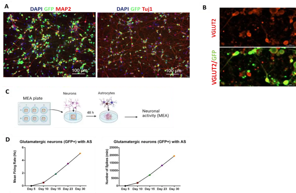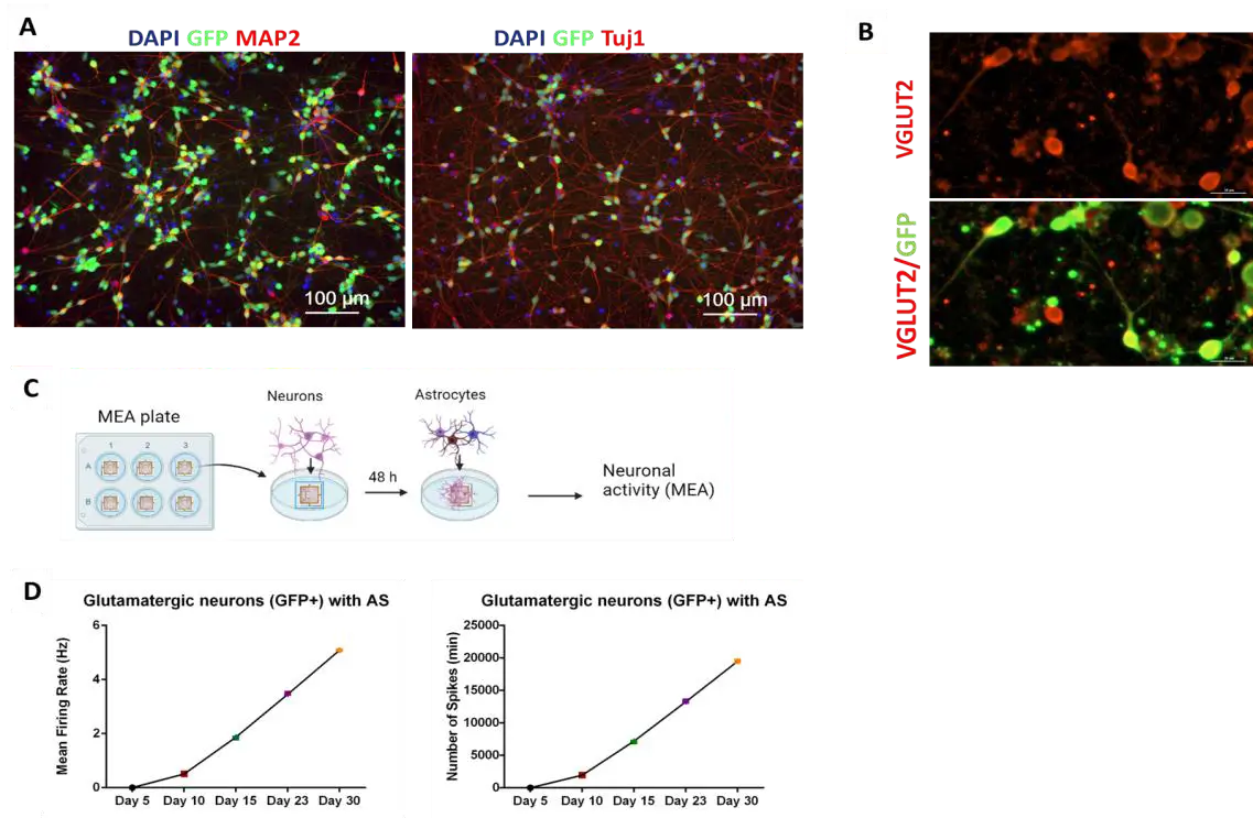 Figure 1. Human iPSCs-derived glutamatergic neurons show expression of characteristic biological markers. (A) Immunostaining shows the expression of neuronal makers MAP2 and Tuj1 at 5 days post-thawing. (B) Immunostaining shows expression of glutamatergic marker VGLUT2, 25 days post-thawing Scale bar 30μm. (C) Glutamatergic neurons were differentiated as a monolayer on a MEA plate and co-cultured with iPSC-derived Astrocytes (40HU-008) and subsequently neuronal activity was measured. (D) The electrical parameters were measured in the MEA over time and the results are graphed as mean ± SEM for mean firing rate and number of spikes..