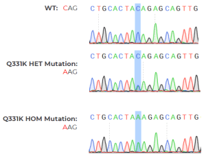 Figure 1.Heterozygous and homozygous Q331K mutation (highlighted) has been introduced to TDP-43 gene using CRISPR/Cas9 based genome editing technology. The targeted site is verified by genomic PCR/Sanger .sequencing.
