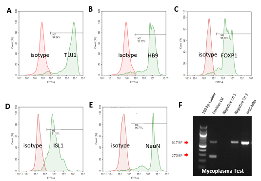 Figure 1. Human iPSC-motor neuron differentiation. (A) Phase contrast image of iPSC before differentiation. Scale bar: 500 µm; (B) Neural spheres upon neural induction on Day 11. Scale bar: 200 µm;(C) Neural rosette formation in neural progenitor cells (NPCs). Scale bar: 100 µm; (D and E) The cryopreserved iPSC-derived motor neurons were recovered and cultured 200,000 viable cells in Motor Neuron Maintenance Medium on PDL / Cultrex-coated wells in the 48-well plate; (D) The cells were fixed and stained with anti-HB9 and anti-TUJ1 on Day 2 post thaw; (E) The cells were fixed and stained with anti-MAP2 and anti-ChAT on Day 7 post thaw. Scale bar: 100 µm.
